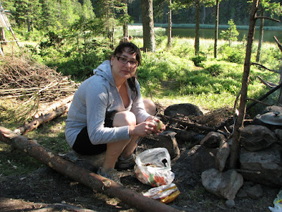 В озере тоже можно купаться для тех, кто не боится холодной воды. В эту ночь был большой ветер - мы укрепляли палатки большими камнями с подветренной стороны, делали каменную стену. Да и палаток было много. а вот утро порадовало нас хорошей погодой и солнышком.